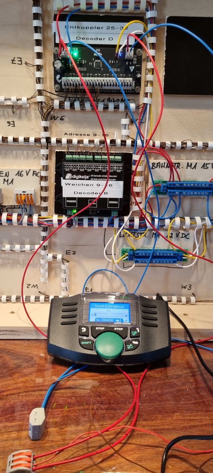 - digikeijs DR4018 für die Weichen (der Decoder hat 8x3 Anschlüsse, also passen 8 Weichen daran)