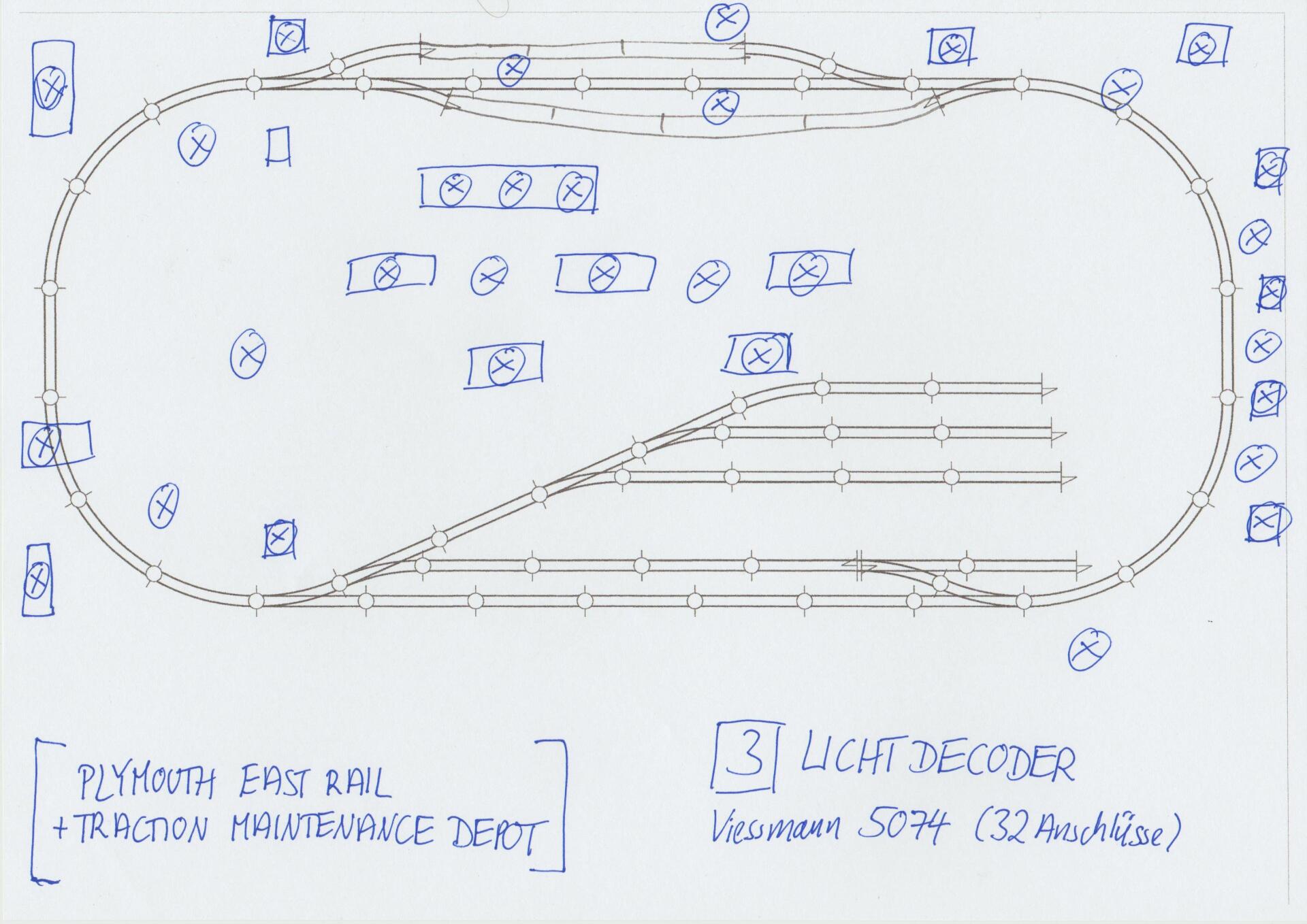 - Für die Steuerung von Weichen mit Motorantrieben kommen evtl. "40802 Weichendecoder zur Steuerung von 8 Weichen mit Motorantriebenstehen" von Decoderwerk zum Einsatz, momentan stehen alternativ zwei digikeijs DR4018 zur Verfügung.